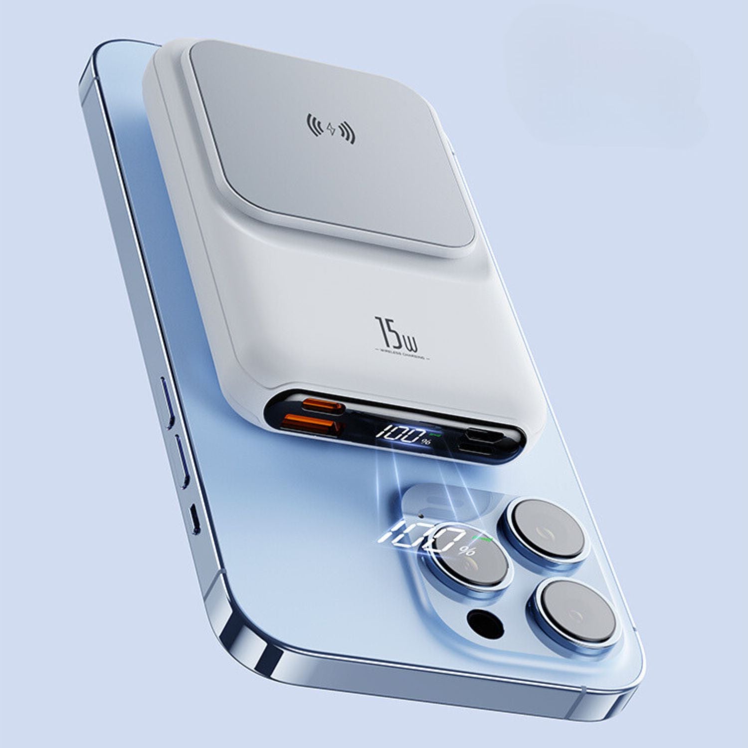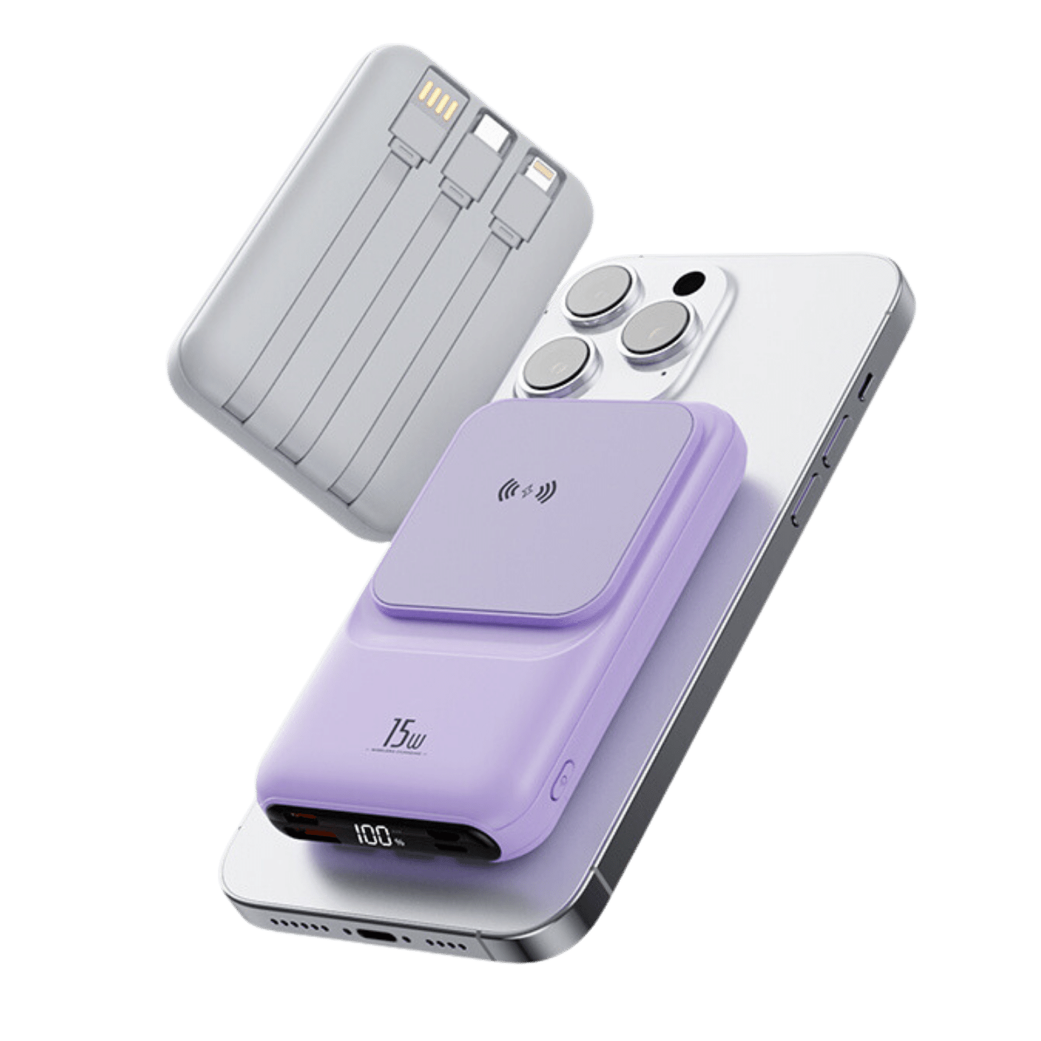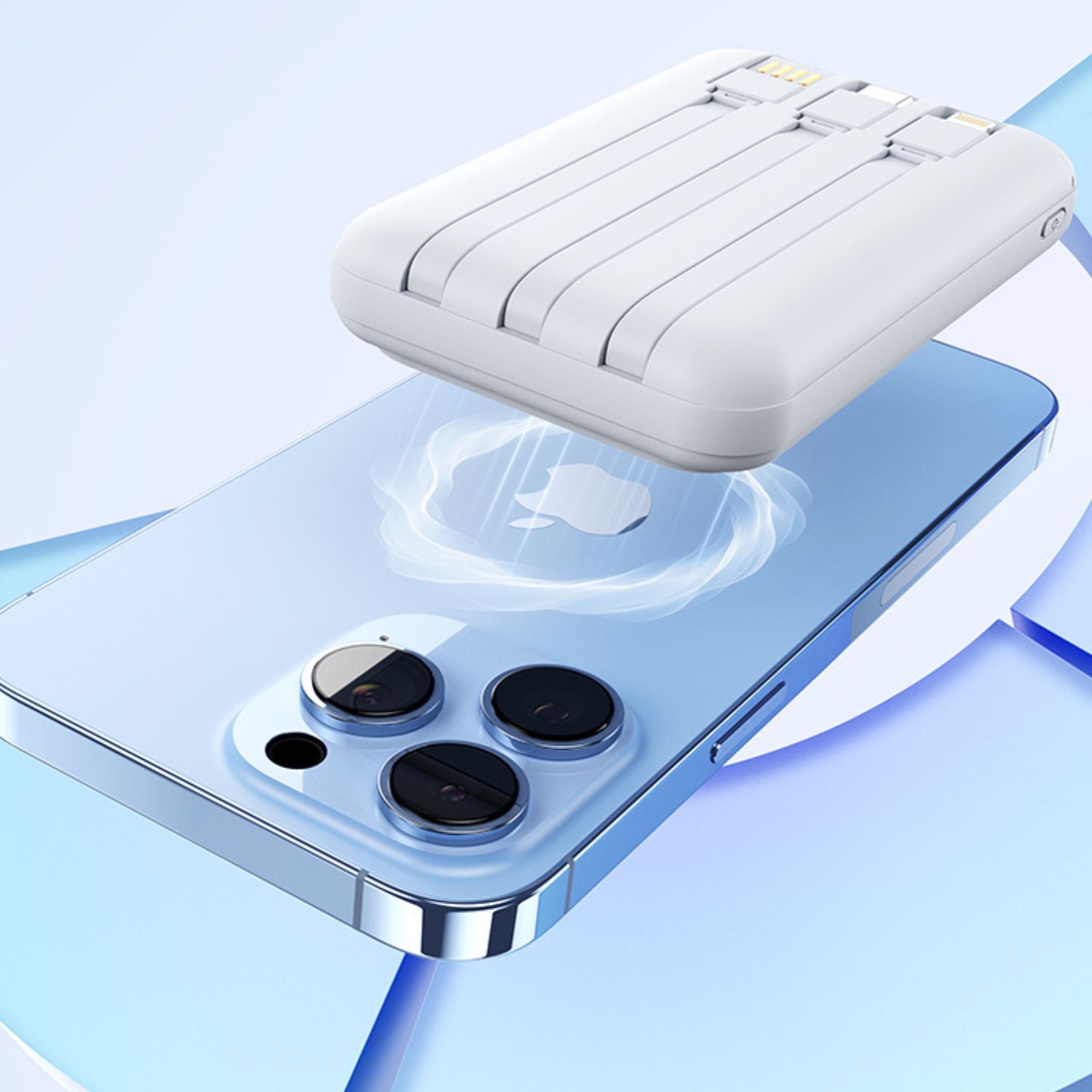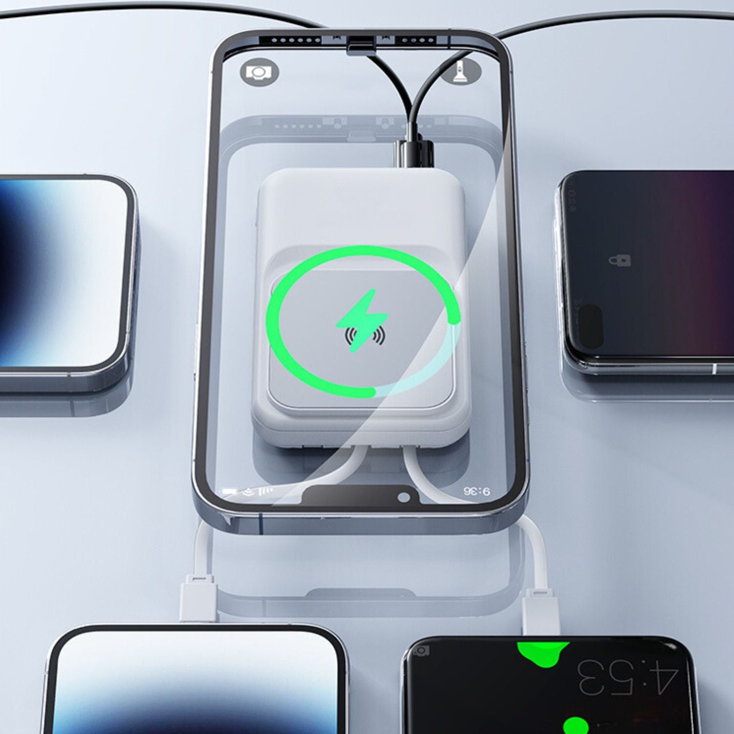 The Power Bank Charges via MagSafe Wireless, Built-in USB-C Cable, Lightning Cable, USB Micro Output, and USB-C Output for Ultimate Compatibility.