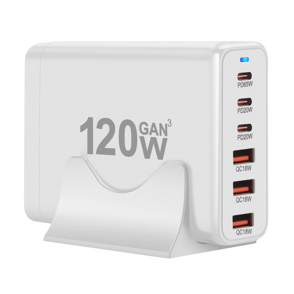 - 120W GaN 6-Port USB-C Charger: Main charging unit equipped with three USB-C and three USB-A ports.